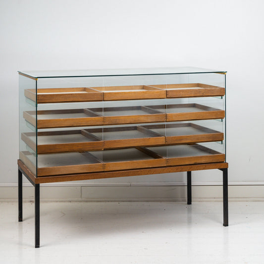 Puinen kauppatiski/korukaappi vedettävillä laatikoilla