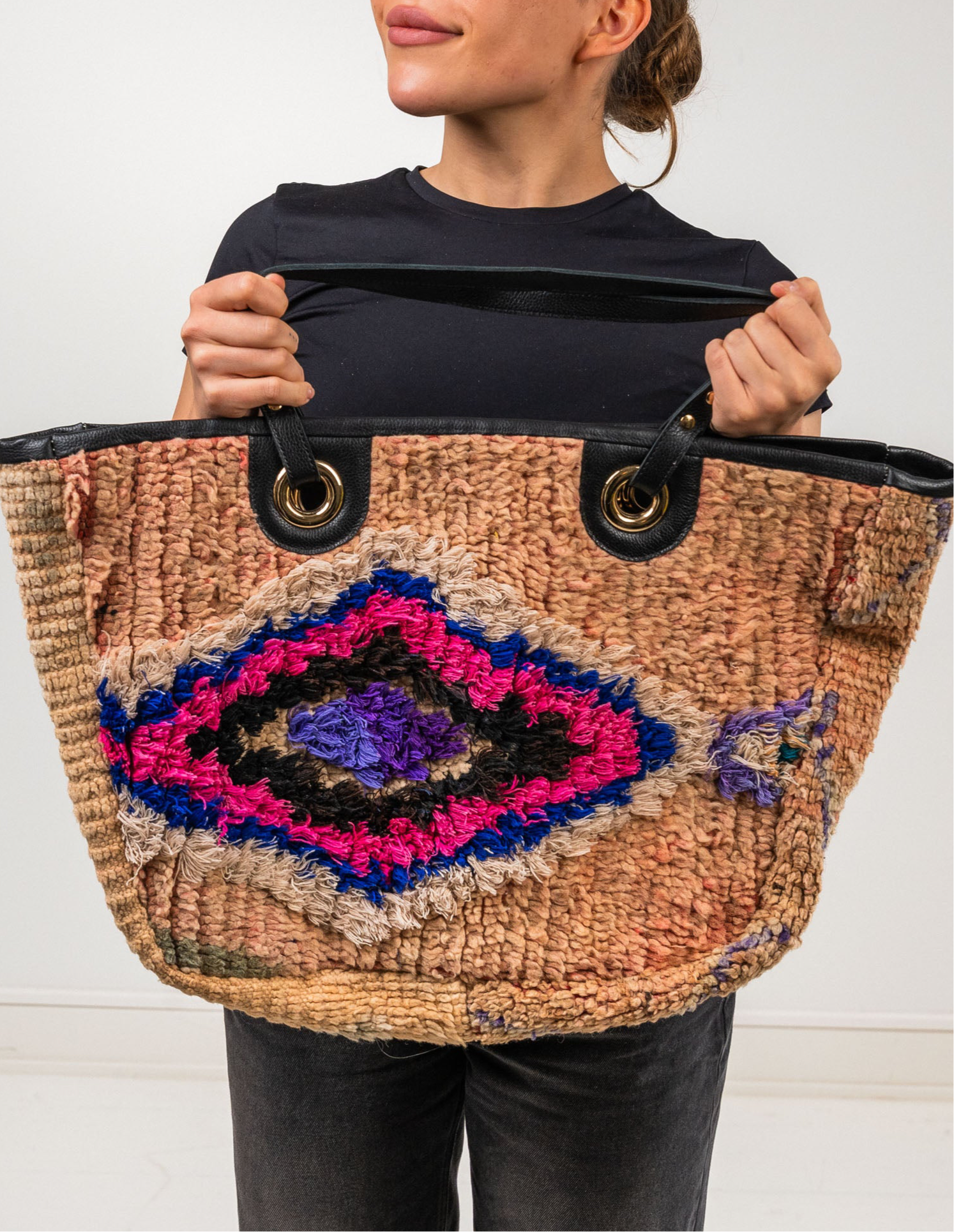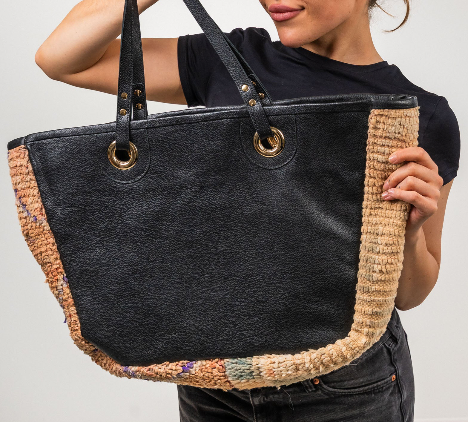 Musta nahkalaukku, Design by Aino Heiniö. Nahka lihateollisuuden ylijäämää, yksityiskohdat marokkolaista lampaanvillamattoa. Suunniteltu ja toteutettu yhteistyössä paikallisten käsityöammattilaisten kanssa. Mature loves.