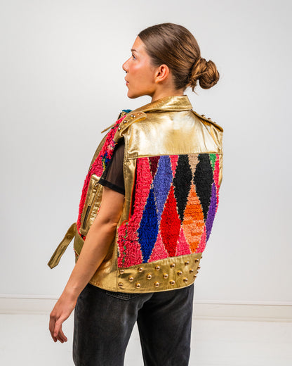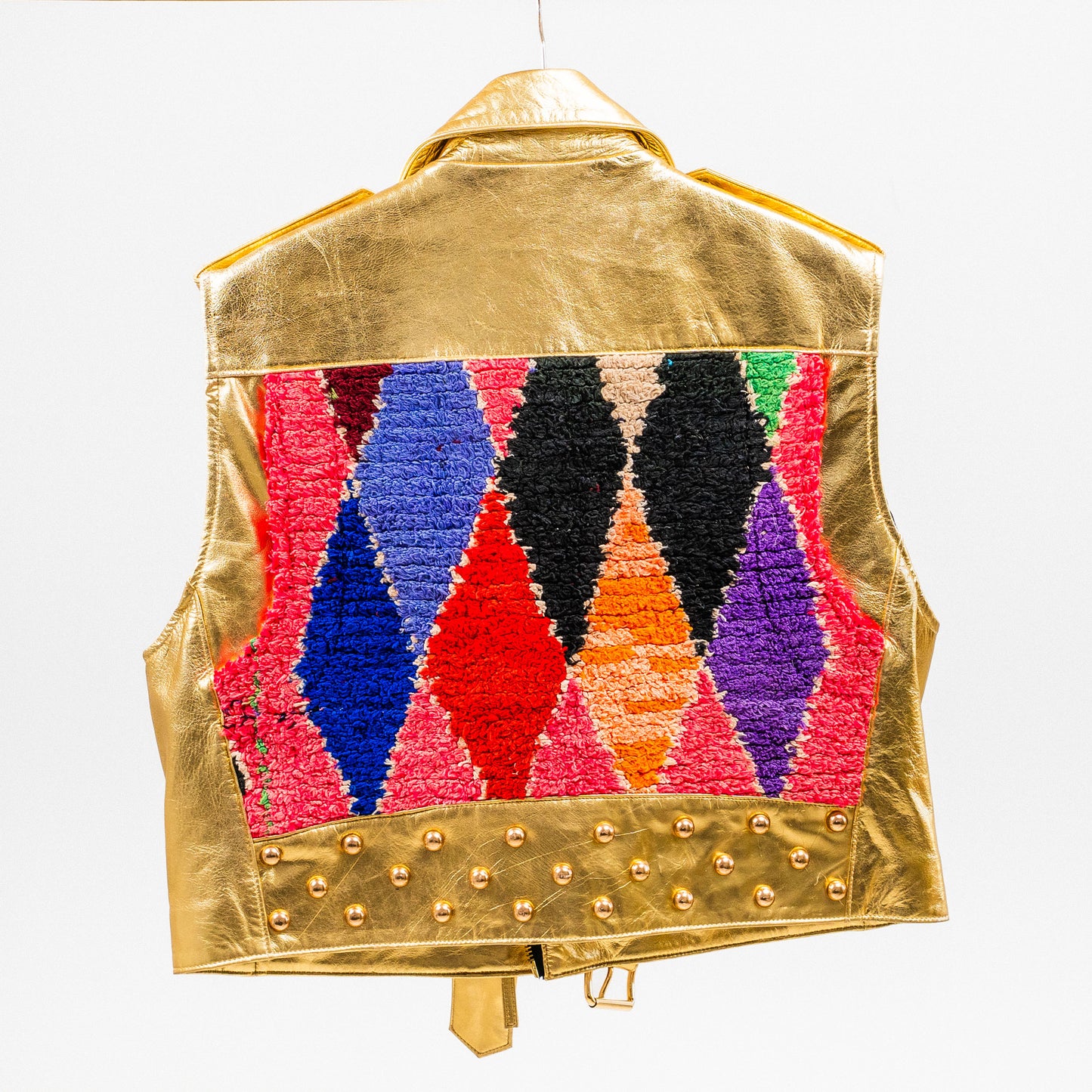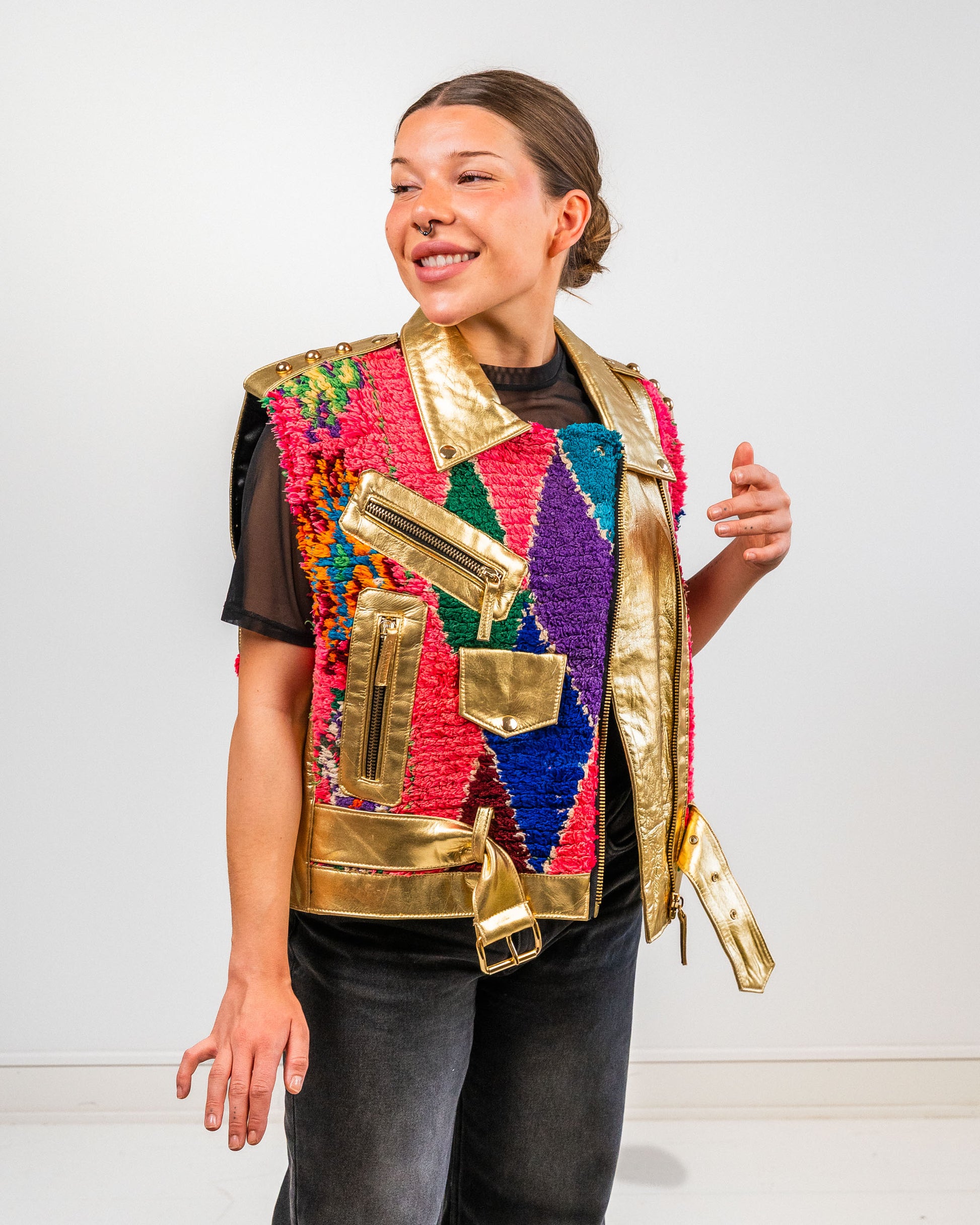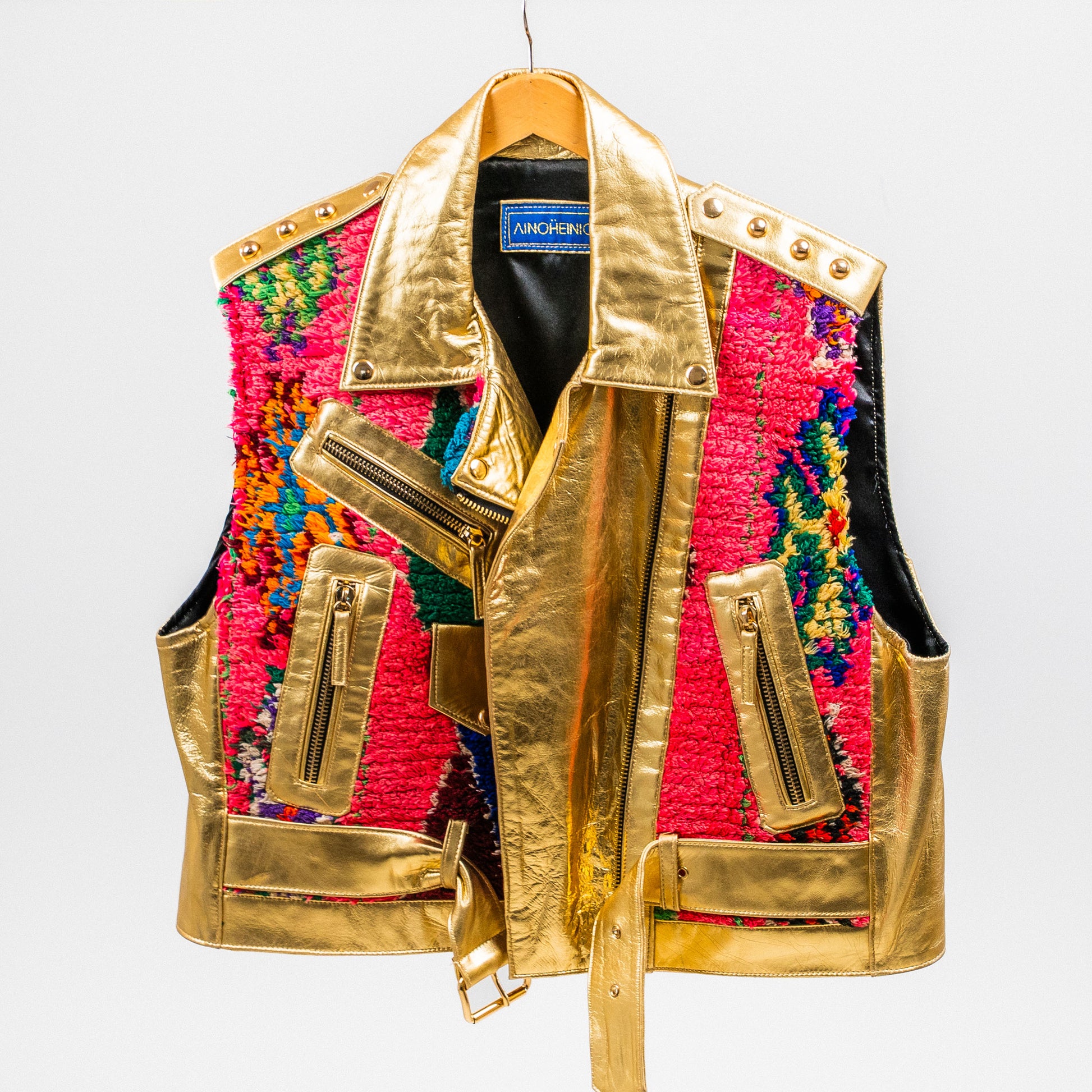 Kultainen nahkaliivi, Design by Aino Heiniö. Nahka lihateollisuuden ylijäämää, yksityiskohdat marokkolaista lampaanvillamattoa. Suunniteltu ja toteutettu yhteistyössä paikallisten käsityöammattilaisten kanssa. Mature loves.