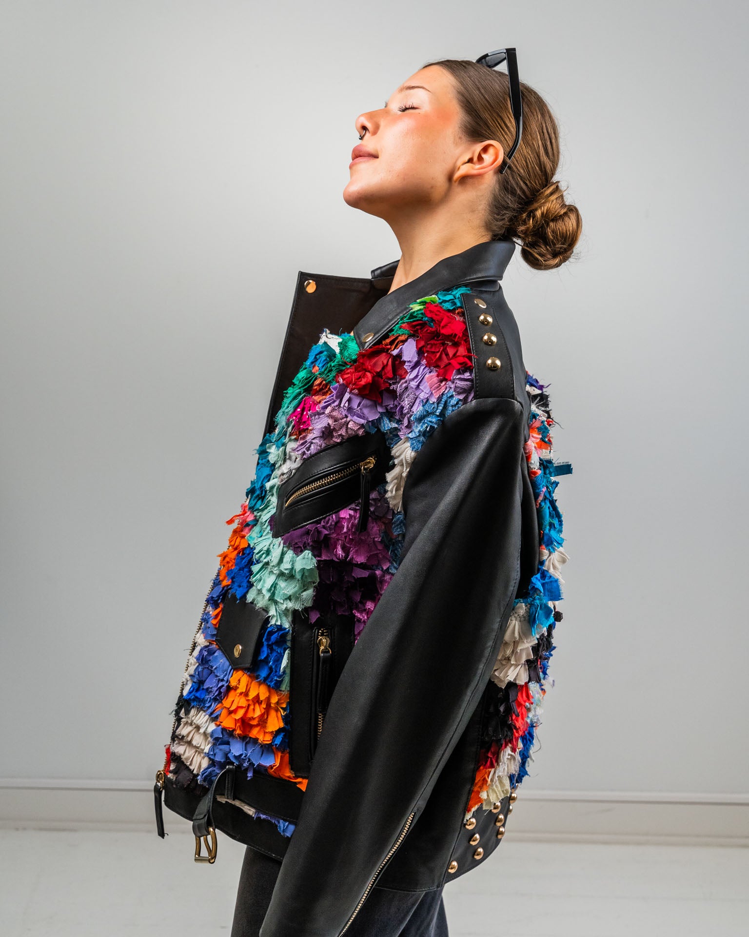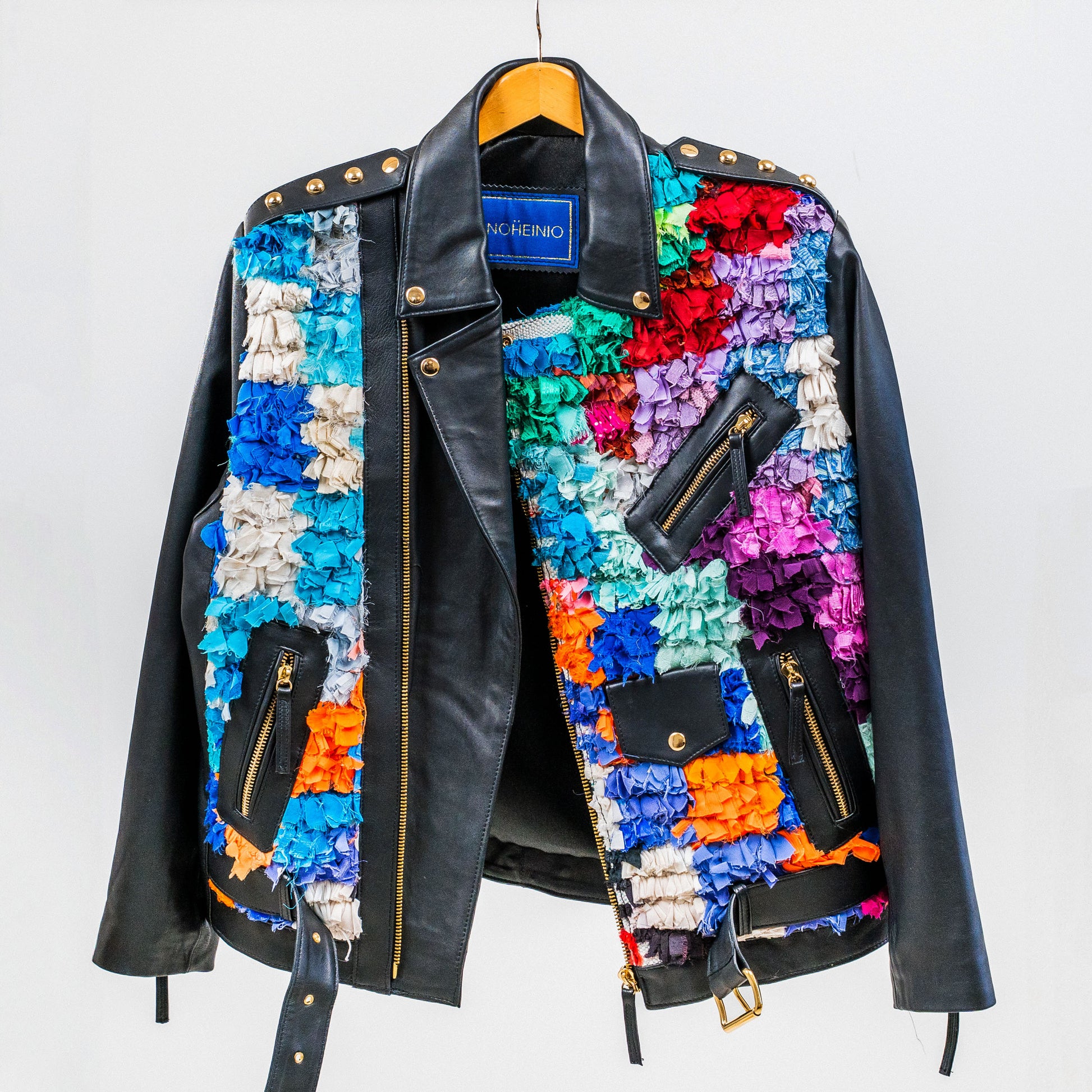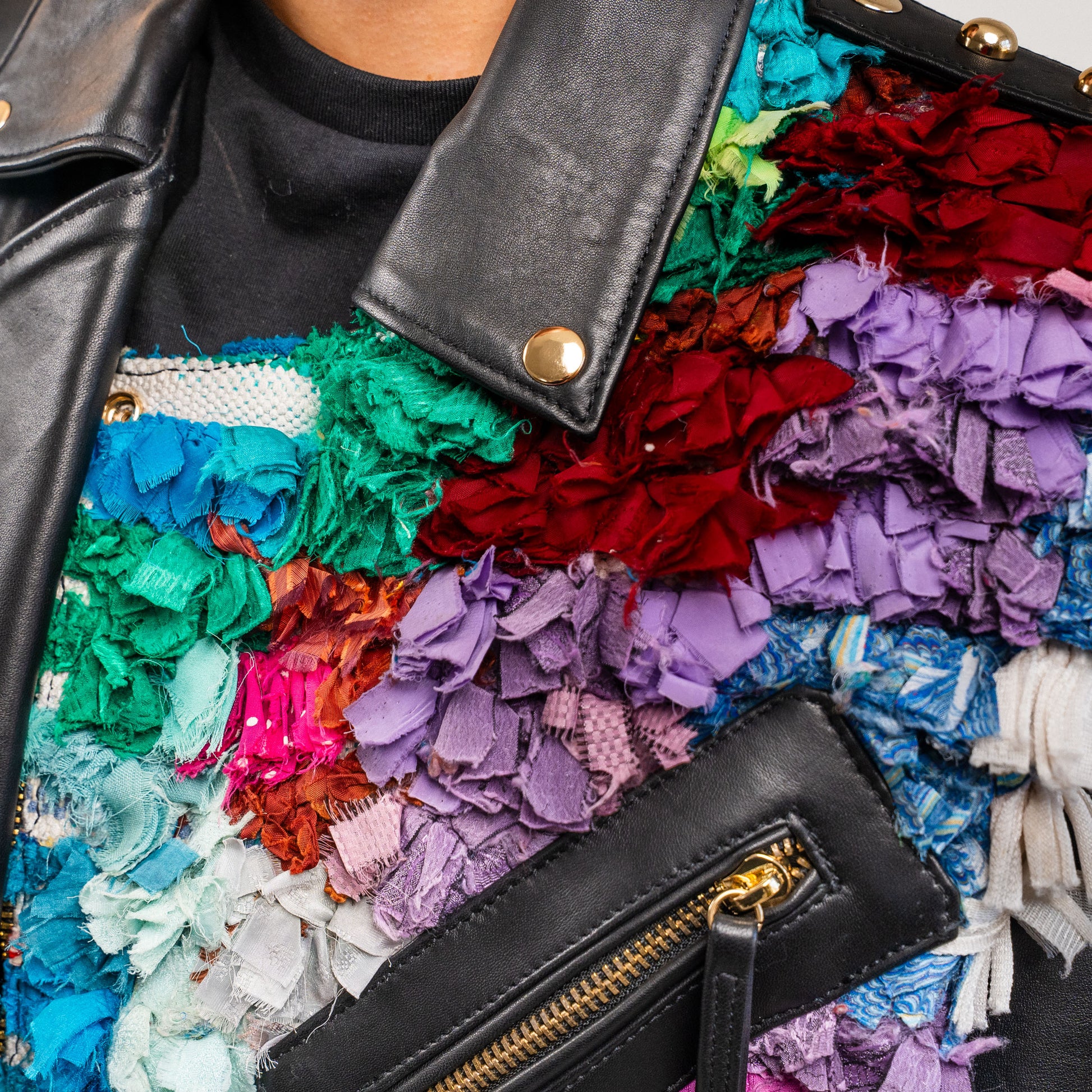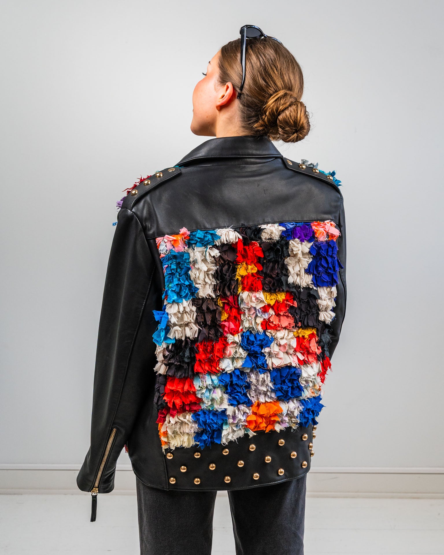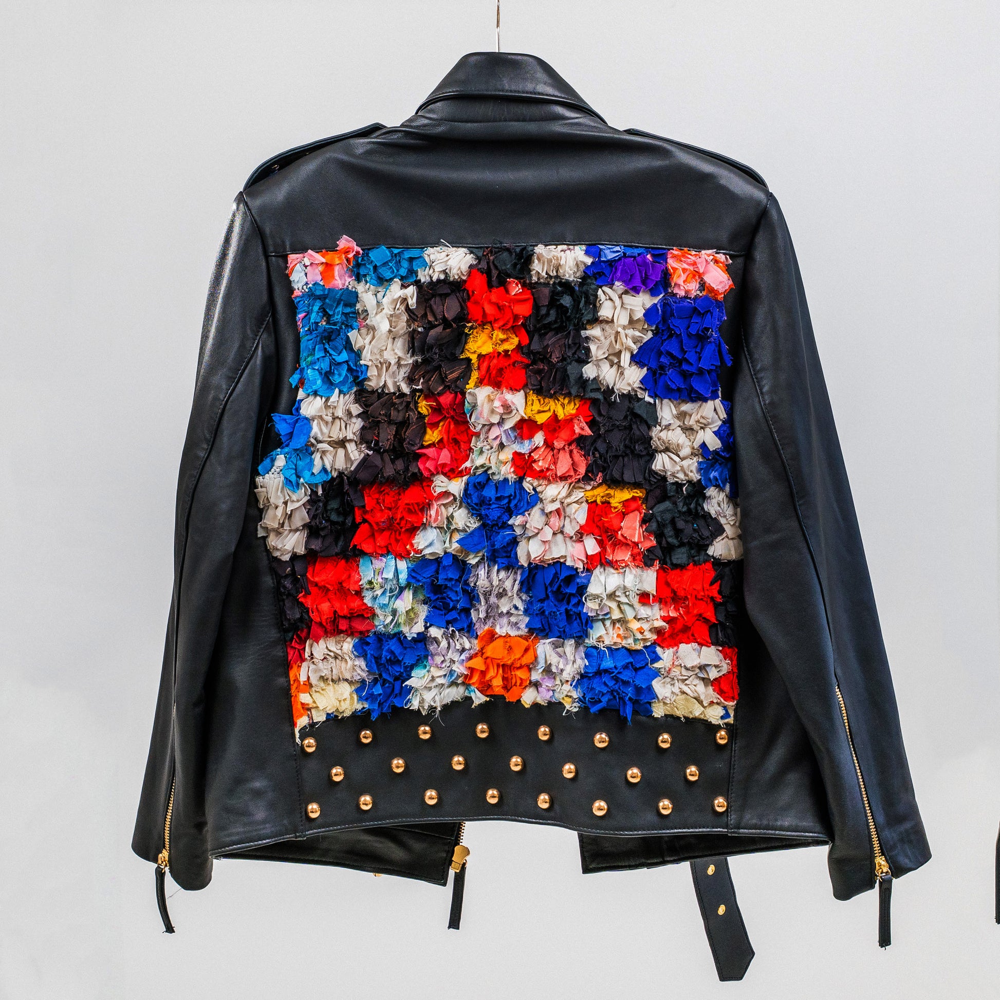 Musta nahkatakki boucherouite-yksityiskohdilla, Design by Aino Heiniö. Nahka lihateollisuuden ylijäämää, yksityiskohdat marokkolaista lampaanvillamattoa. Suunniteltu ja toteutettu yhteistyössä paikallisten käsityöammattilaisten kanssa. Mature loves.