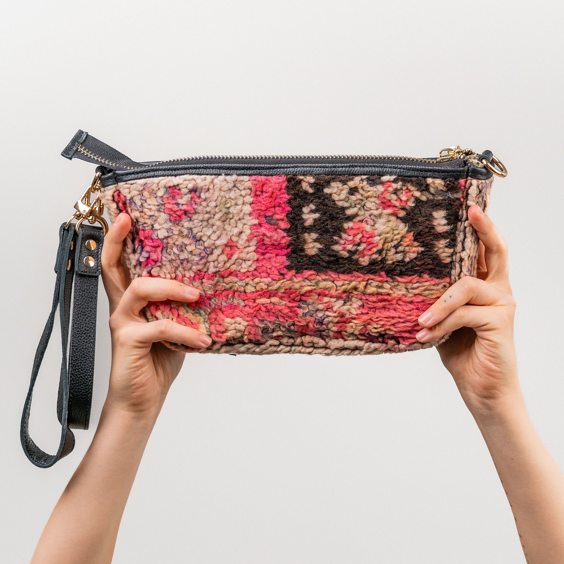 Musta pikkulaukku, Design by Aino Heiniö. Nahka lihateollisuuden ylijäämää, yksityiskohdat marokkolaista lampaanvillamattoa. Suunniteltu ja toteutettu yhteistyössä paikallisten käsityöammattilaisten kanssa. Mature loves.