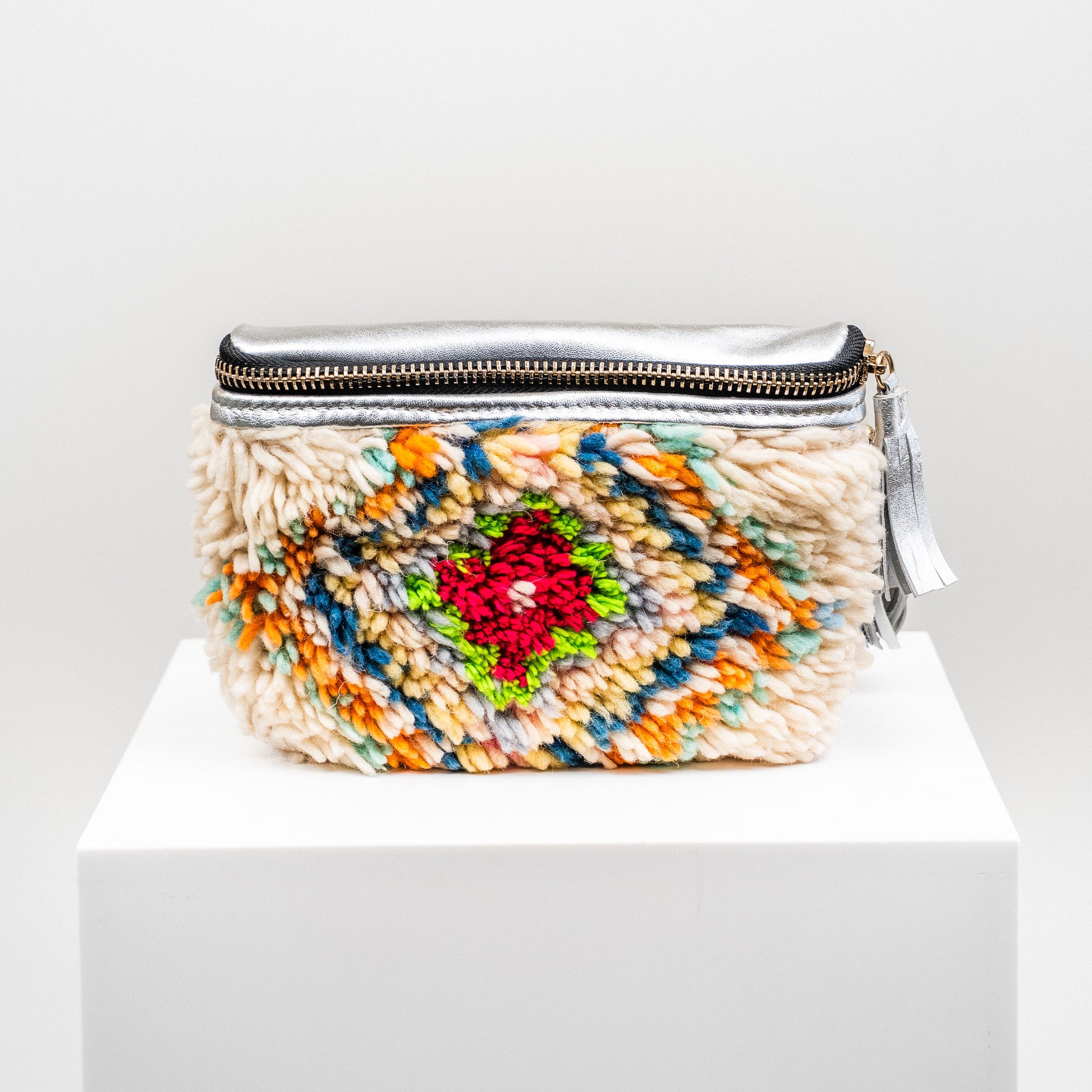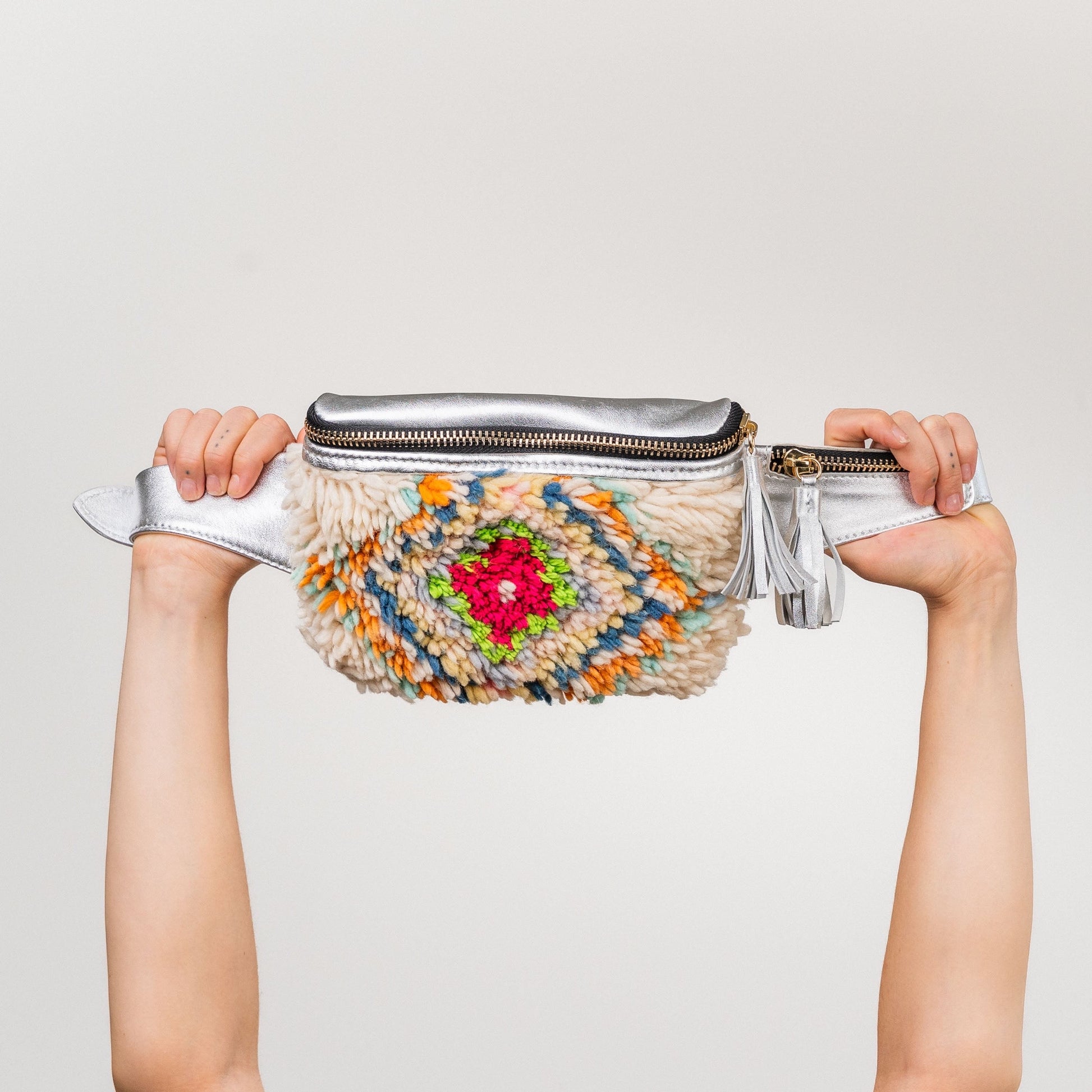 Hopea vyölaukku, Design by Aino Heiniö. Nahka lihateollisuuden ylijäämää, yksityiskohdat marokkolaista lampaanvillamattoa. Suunniteltu ja toteutettu yhteistyössä paikallisten käsityöammattilaisten kanssa. Mature loves.
