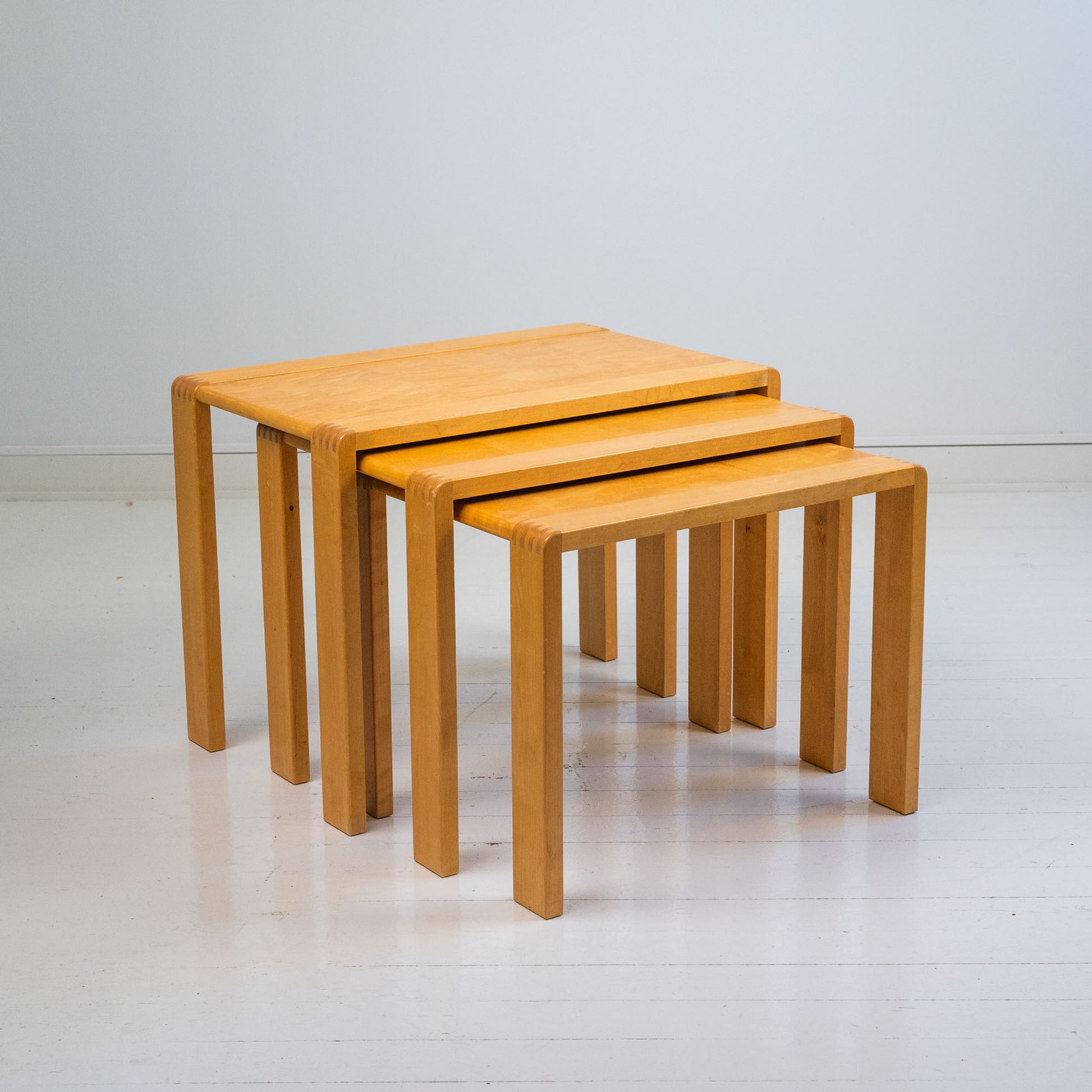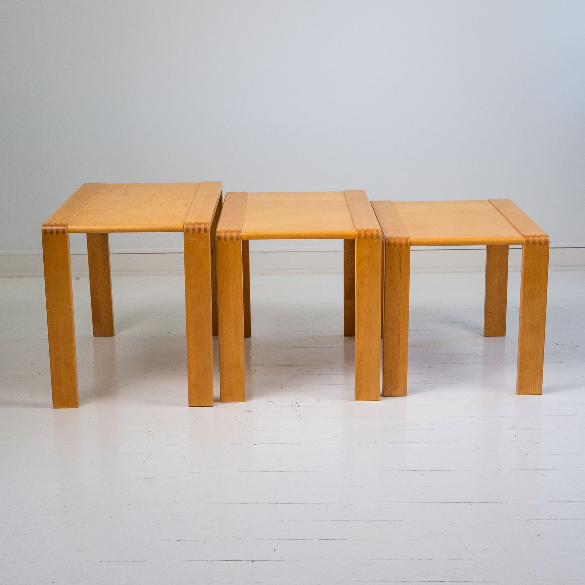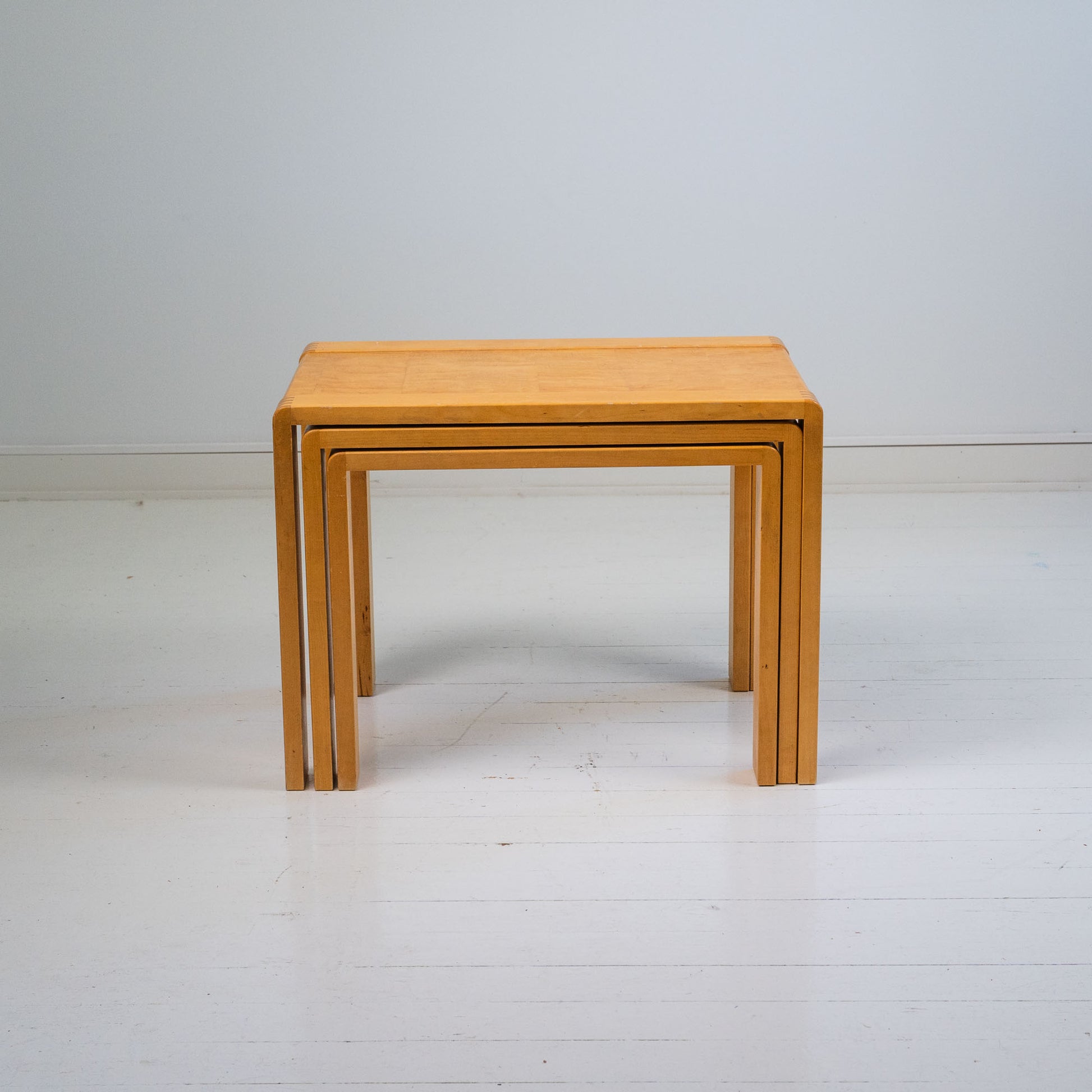 Tästä kolmikosta ei löydy tietoa. On Esko Pajamiehen suunnittelemat ja kivat. Pöydät toimivat kuten Maatuska-puunuket eli menevät sisäkkäin. Helppo laittaa seinän viereen ja räväyttää kolmikko esiin kun sen aika on.