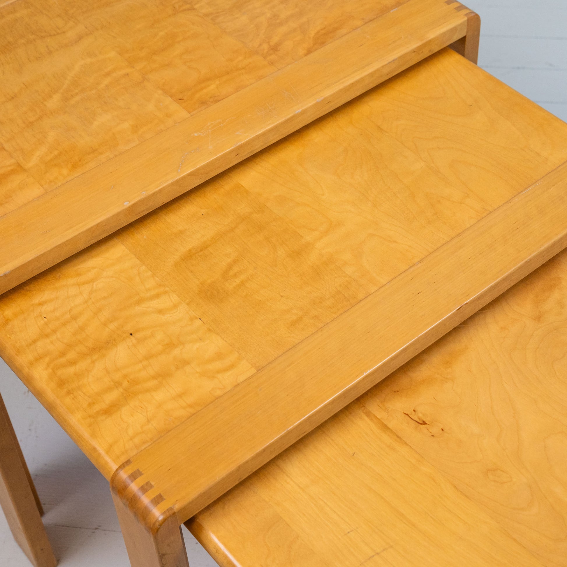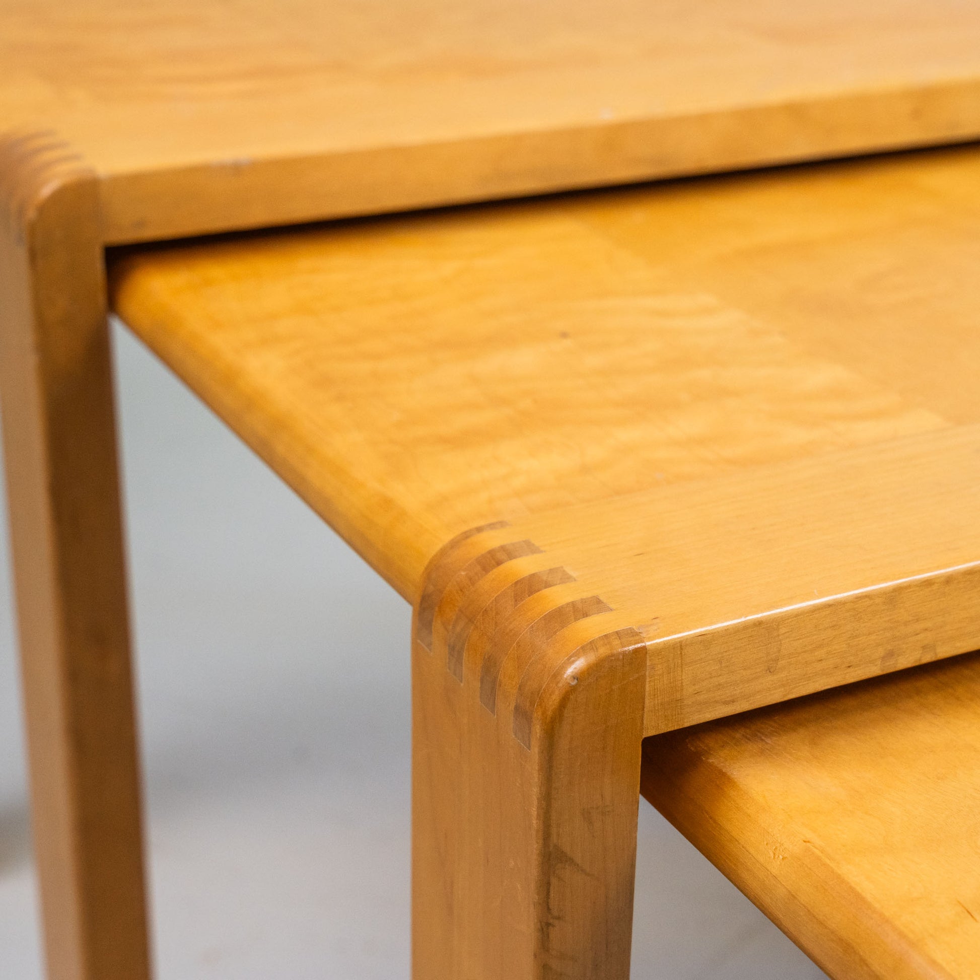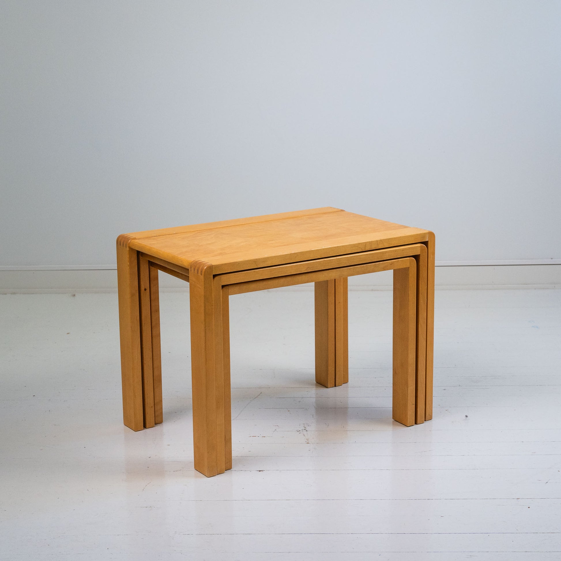 Tästä kolmikosta ei löydy tietoa. On Esko Pajamiehen suunnittelemat ja kivat. Pöydät toimivat kuten Maatuska-puunuket eli menevät sisäkkäin. Helppo laittaa seinän viereen ja räväyttää kolmikko esiin kun sen aika on.