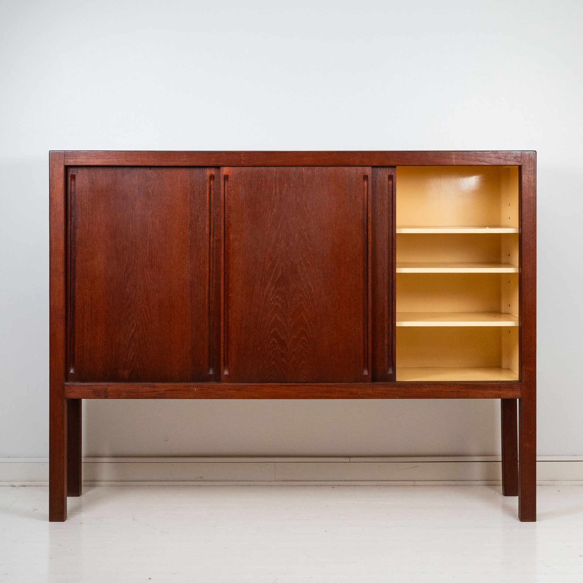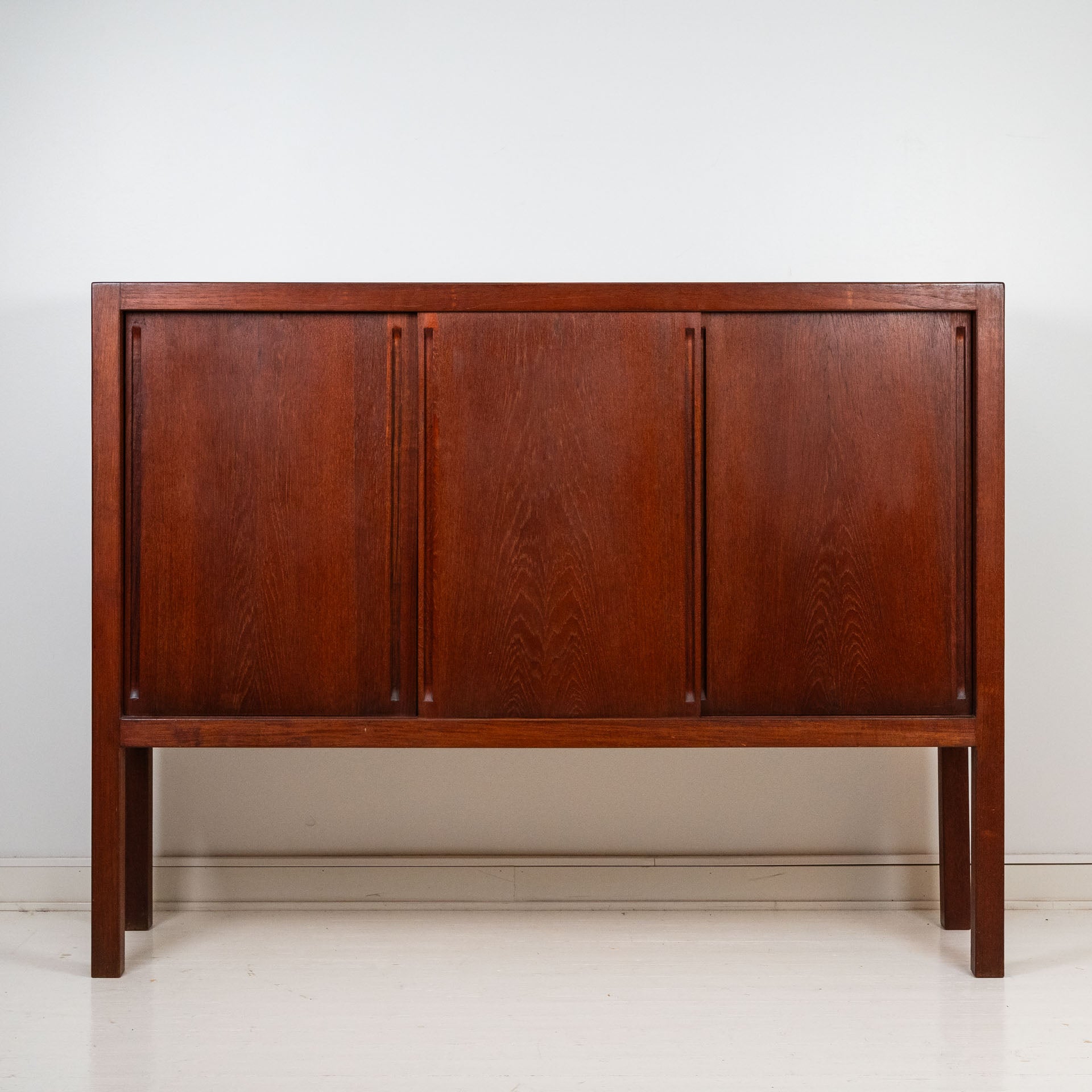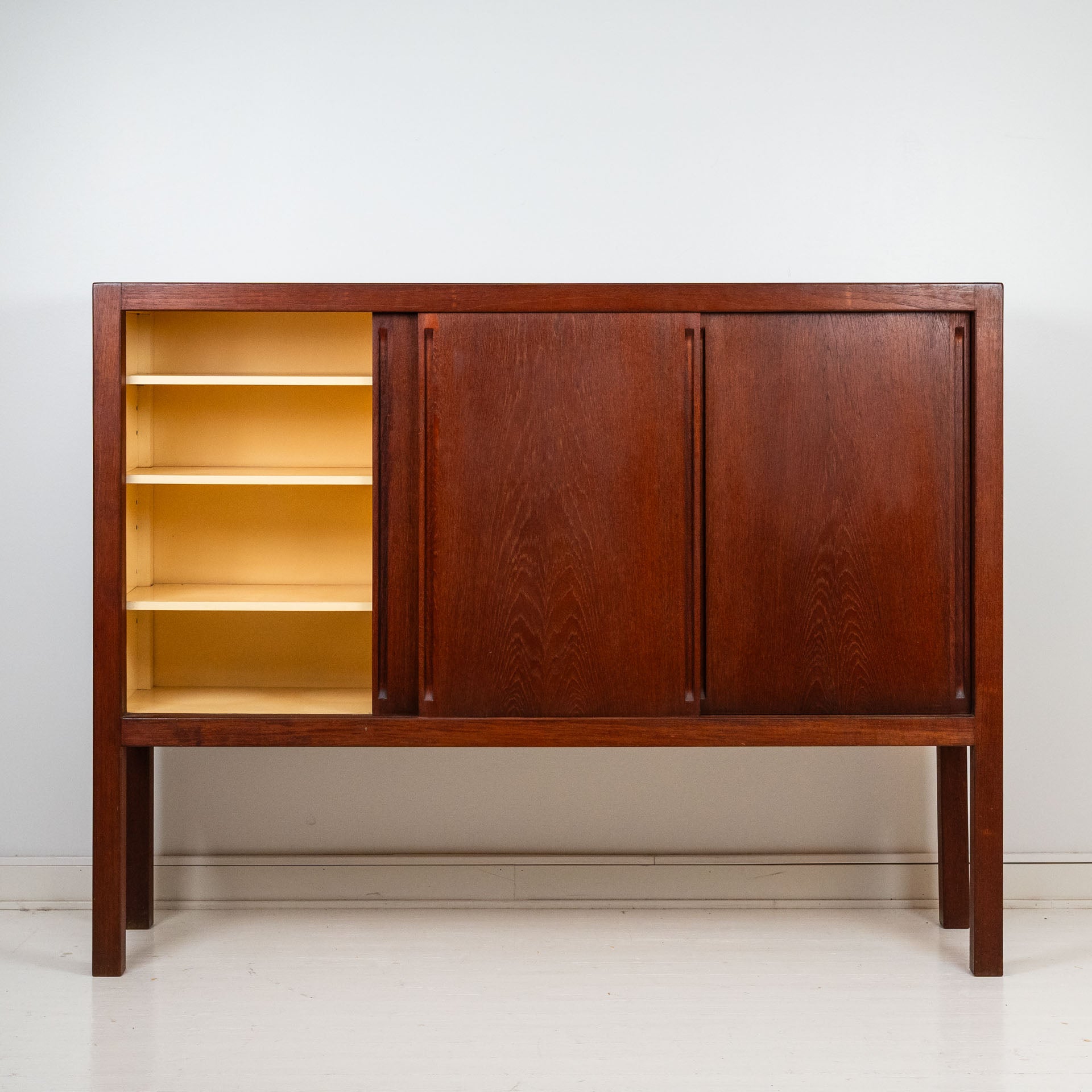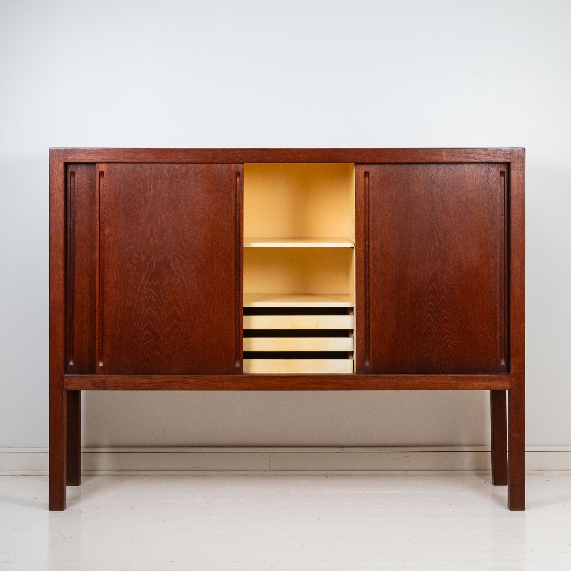 Carl-Gustaf Vilhelm ”Nalle” Hiort af Ornäs (1911–1996) oli suomalainen Milanon triennaalissakin huonekaluineen nähty hienoniminen sisustusarkkitehti ja tässä miehen suunnittelema ja HMN Huonekalu Mikko Nupposen valmistama tiikkinen Näyttely-astiakaappi kolmella liukuovella.