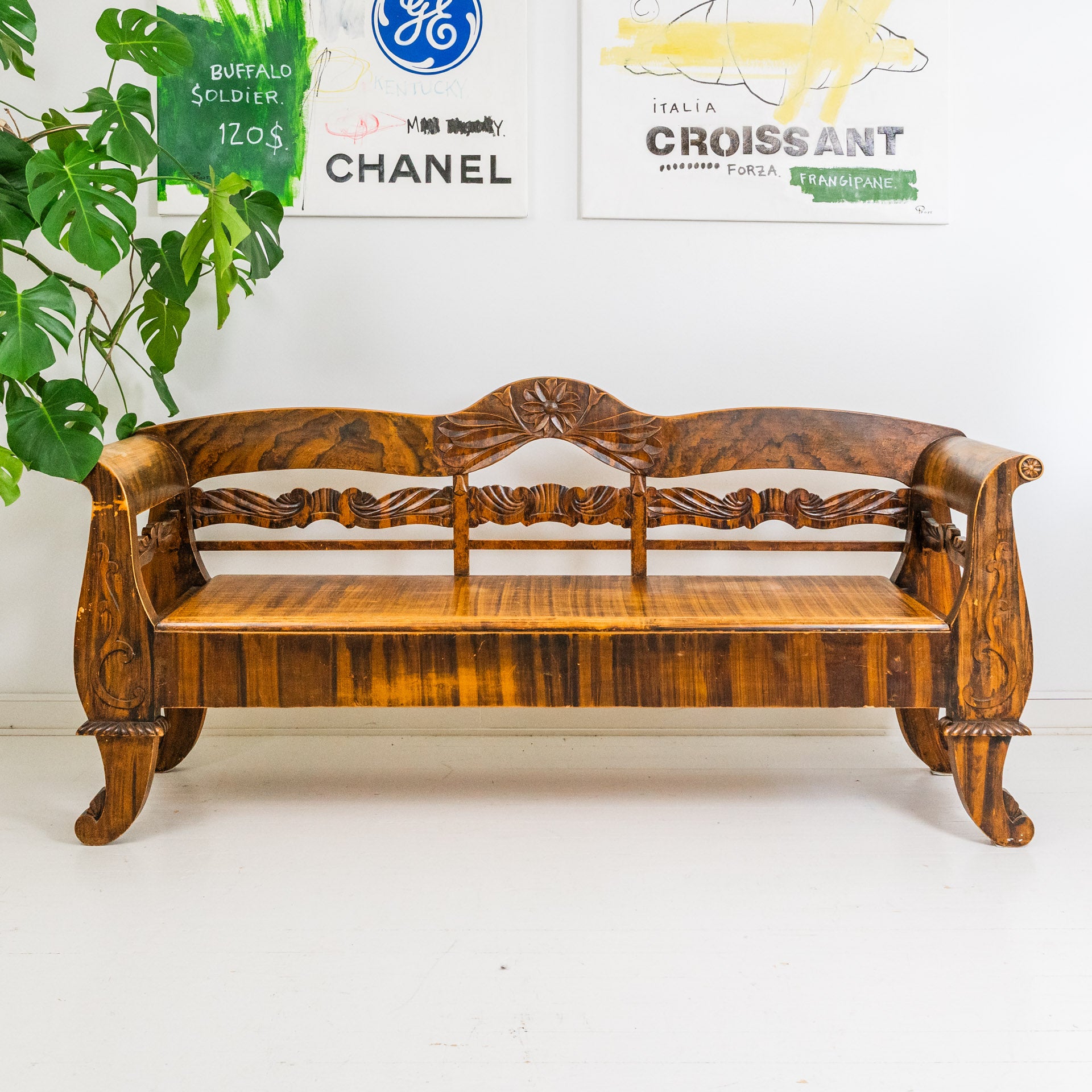 Tällä Karl-Johan-tyylisellä, todennäköisesti Dalslandista peräisin olevalla 1800-lukulaisella puusohvalla kelpaa istua selkä suorassa ja miettiä niitä aikoja, kun kaikki oli vielä kunnollista, kellään ei ollut kännykkäniskaa ja ihmiset elivät kirjaimellisesti hetken, koska elinajanodote oli noin 40 vuotta.
