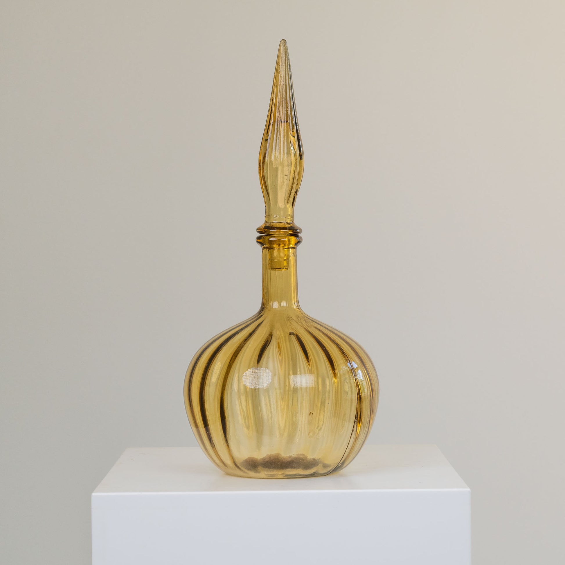 Keltainen piikkikorkkinen lasipullo. Mystistä, että on tyhjä mutta täynnä dramatiikkaa.