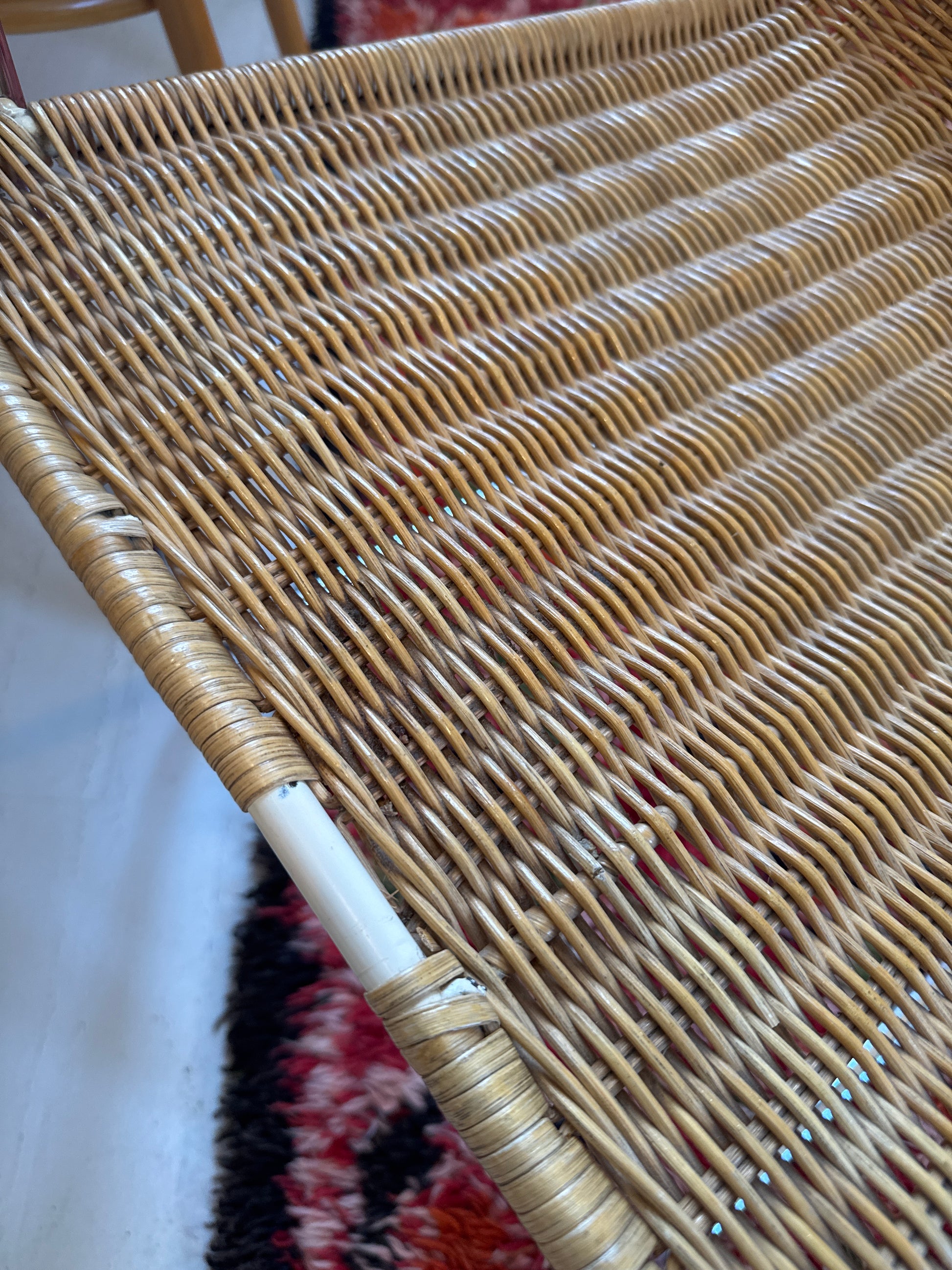 Viimeisessä kuvassa näkyy etuosan irronnut rottinkinauha. Virhe huomioitu hinnassa.