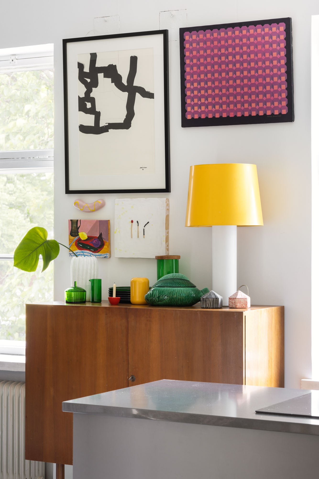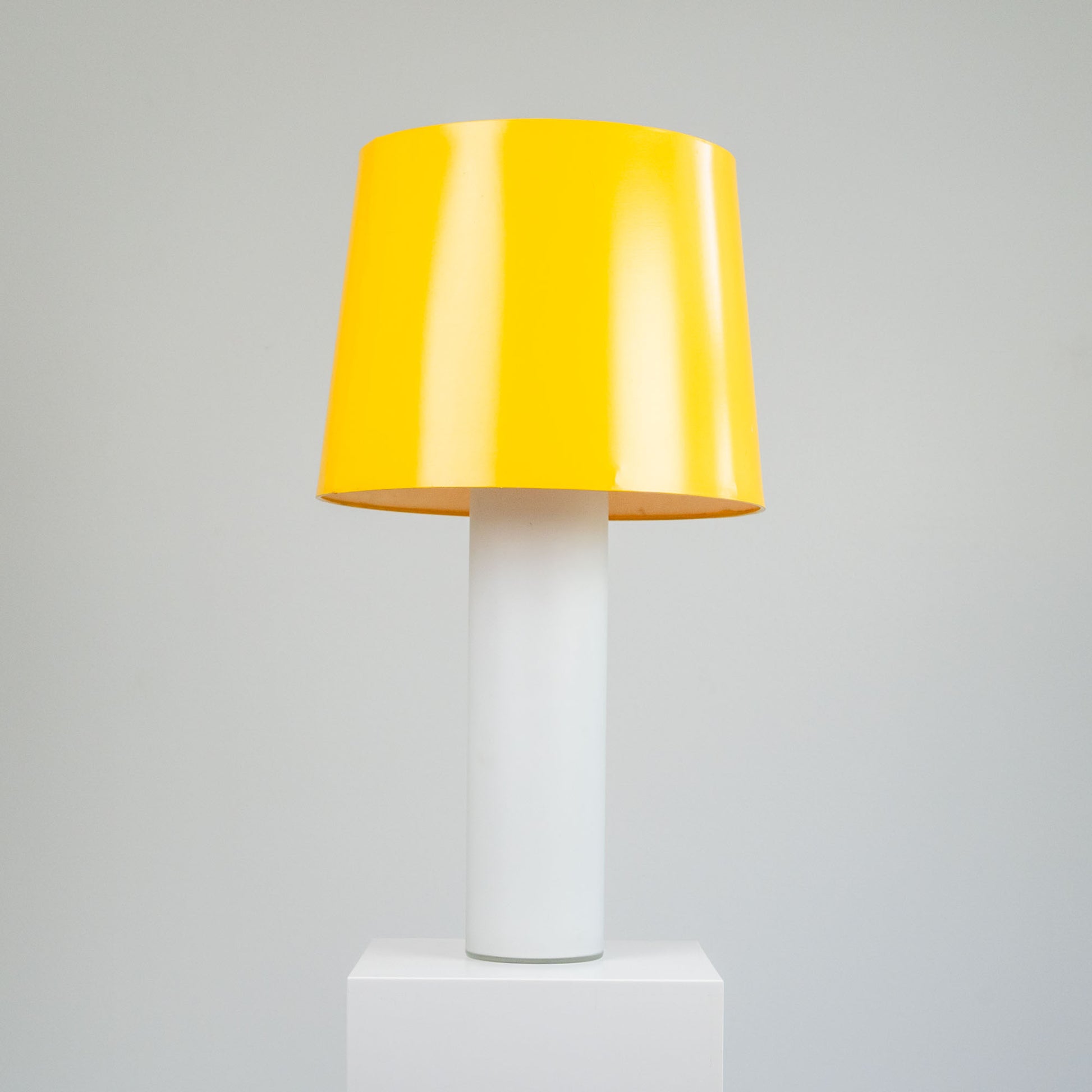 Ruotsalaisten suunnittelijaveljesten Uno ja Östen Kristianssonin pöytävalaisin Luxukselle. Jalka valkoista opaalilasia, varjostin upean auringonkeltainen. Merkitty.
